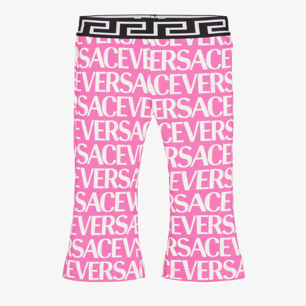 Little girls pink flared trousers by Versace. Soft and stretchy, they have a bootleg cut at the ankles and a Repeat white logo print throughout. The elasticated waistband has a white jacquard La Greca pattern.