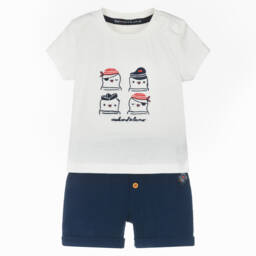 Made in soft, comfortable cotton jersey, this little boys shorts set is by Week-end à la mer. The white T-shirt has the brand's signature Breton stripes in navy blue, with embroidered land wind surfers on the front. On smaller sizes there are popper fastenings on one shoulder for speedy dressing. The pull-up green shorts have a navy blue, elasticated waistband.