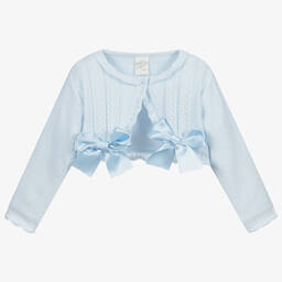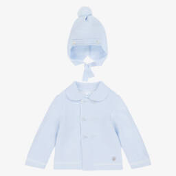 In the style of a jacket, this blue double-breasted cardigan for baby boys and girls is by Artesanía Granlei. Simple and classic, it has a charming rounded collar and fastens with lovely pearlescent buttons on the chest.