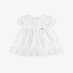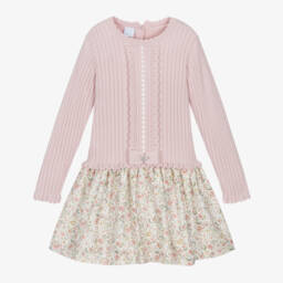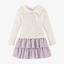 Beige dress for girls by Spanish brand Artesanía Granlei, in a ribbed cotton-blend knit. This sleeveless design has a fully lined skirt and an oversized voile collar with a frilly edge. It has striped detailing and a signature logo charm stitched on the waist. Neat buttons fasten on the back of the neck.