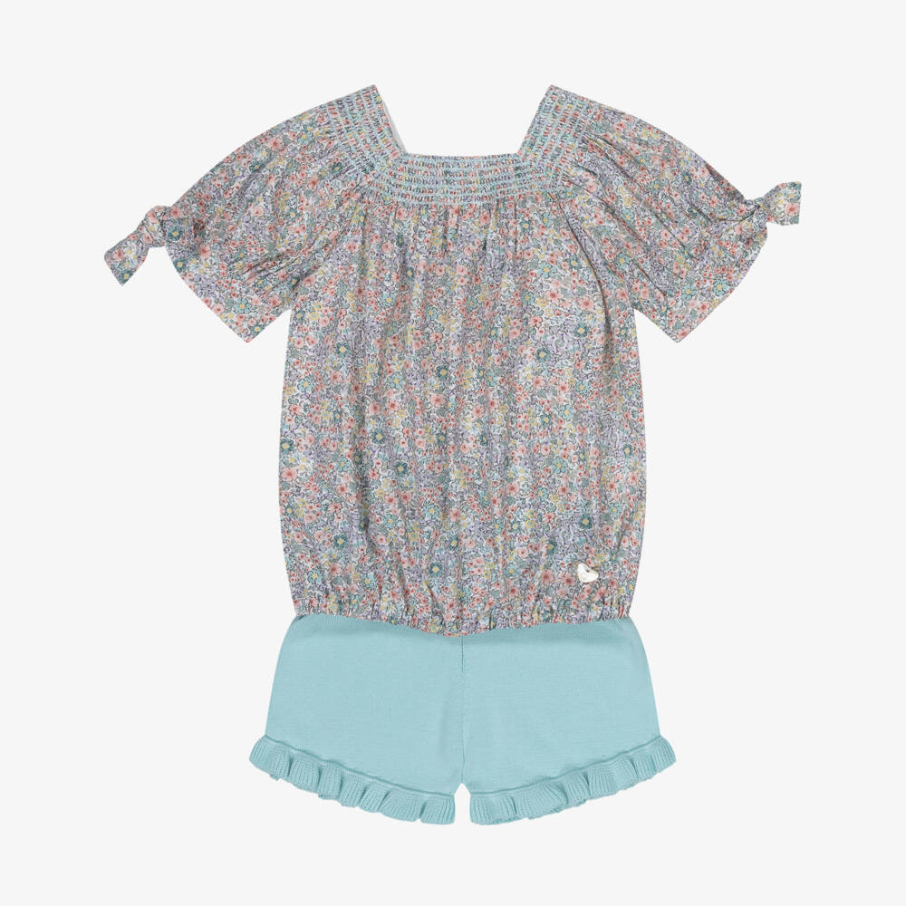 Lovely floral cotton top and aqua green shorts set for girls by Artesanía Granlei. Beautifully patterned in shades of lilac, green and pink, the charming top has a smocked-effect neckline and puffed sleeves with tied cuffs. The hem is elasticated and there are button fastenings on the back. It pairs with knitted shorts that have an adjustable waist for a comfortable fit.