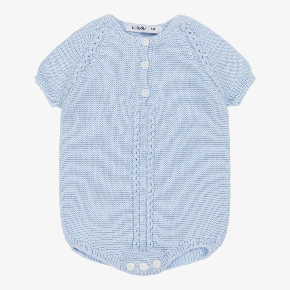 A sweet, blue knitted shortie for baby boys from Babidu. Made with soft cotton yarn, this traditional babysuit has lovely cable knit detail and fastens with buttons on the front and between the legs.