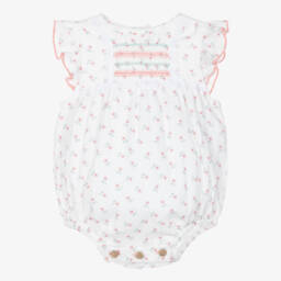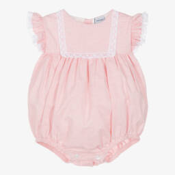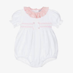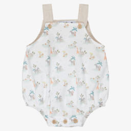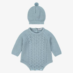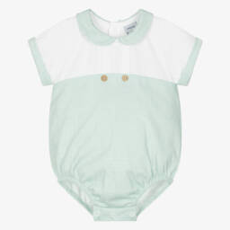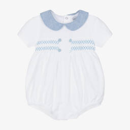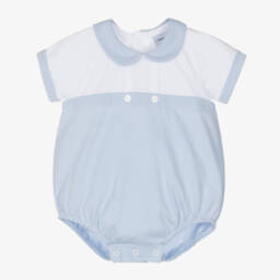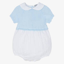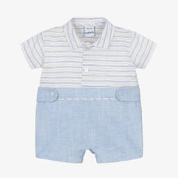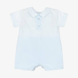 Sweet pale blue cotton shortie for baby boys by Babidu, made in soft waffle jersey. It has a blue stripe, woven insert and collar, and charming pintuck detail on the chest. There are popper fastenings on the back and between the legs.