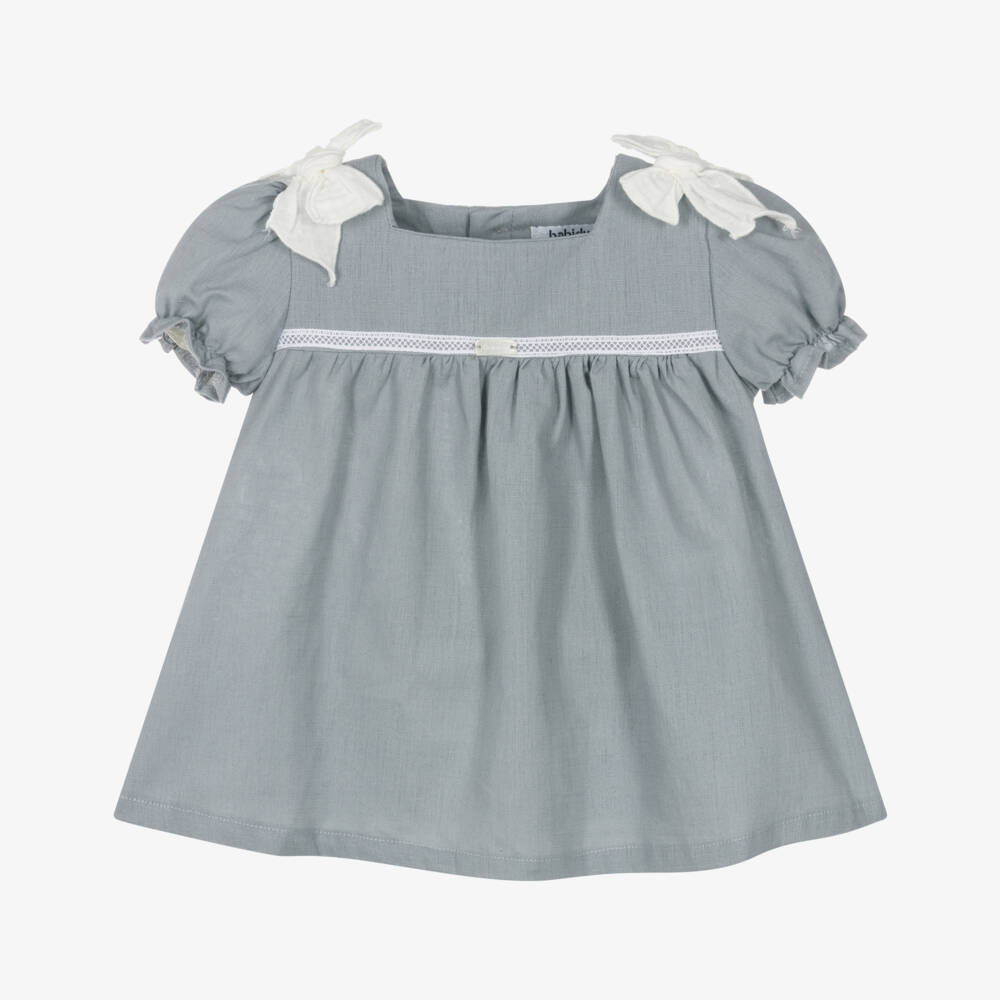 Charming grey cotton dress for baby girls by Babidu, trimmed with delicate white lace and pretty bows. Soft and lightweight, this classic style has a square neckline and puffed sleeves with gently elasticated cuffs. It fastens with buttons on the back and comes with a pair of matching knickers.