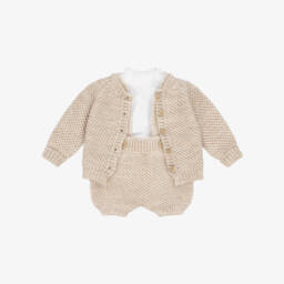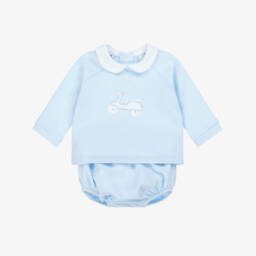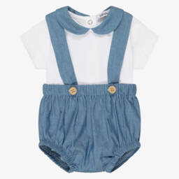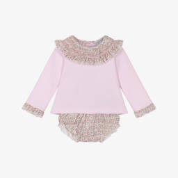 White and pink cotton shorts set by Babidu, designed for baby girls. The comfortable jersey top has a pretty ruffled collar and gently elasticated, frilled cuffs. It is paired with matching pink shorts that have a cute ruffle all around and elasticated trims.