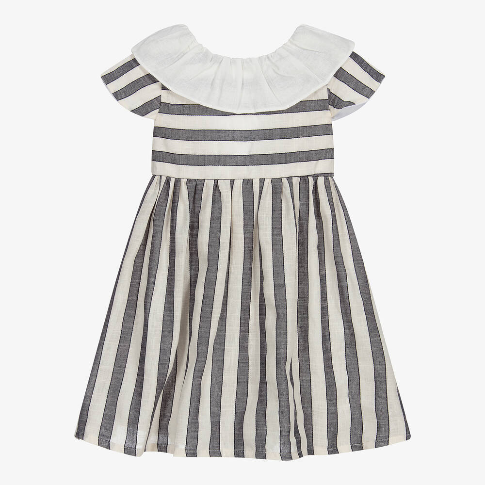 Girls navy blue and ivory striped cotton dress by Babidu. This pretty design has a white ruffle collar and a v-shaped back. There are faux wooden back button fastenings and a large fixed bow.