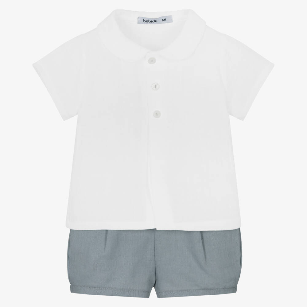 A sweet white and grey cotton shorts set for little boys by Babidu. The short-sleeved shirt is made from wonderfully soft cheesecloth. It fastens neatly with pearlescent buttons. Completing the classic look, the lightweight woven shorts have a gently elasticated waistband for a comfortable fit.