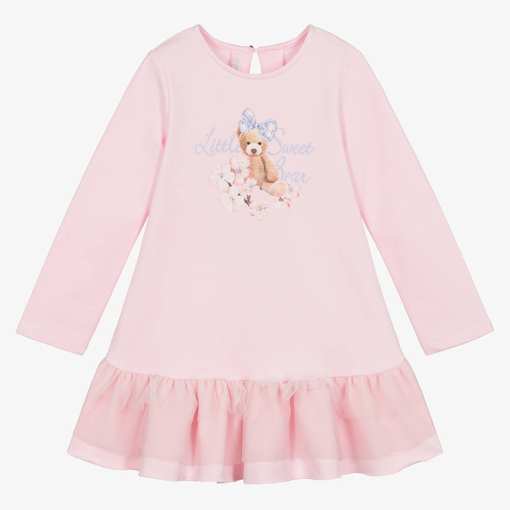 Adorable pink dress for girls by Balloon Chic, made from soft, mid-weight jersey with a fleecy interior. Printed on the front is a lovely teddy bear with a diamanté bow, pink flowers, and the words 'little sweet bear' for a cute look. There is a pink tulle ruffle trim by the hem, and a keyhole button fastening on the back.