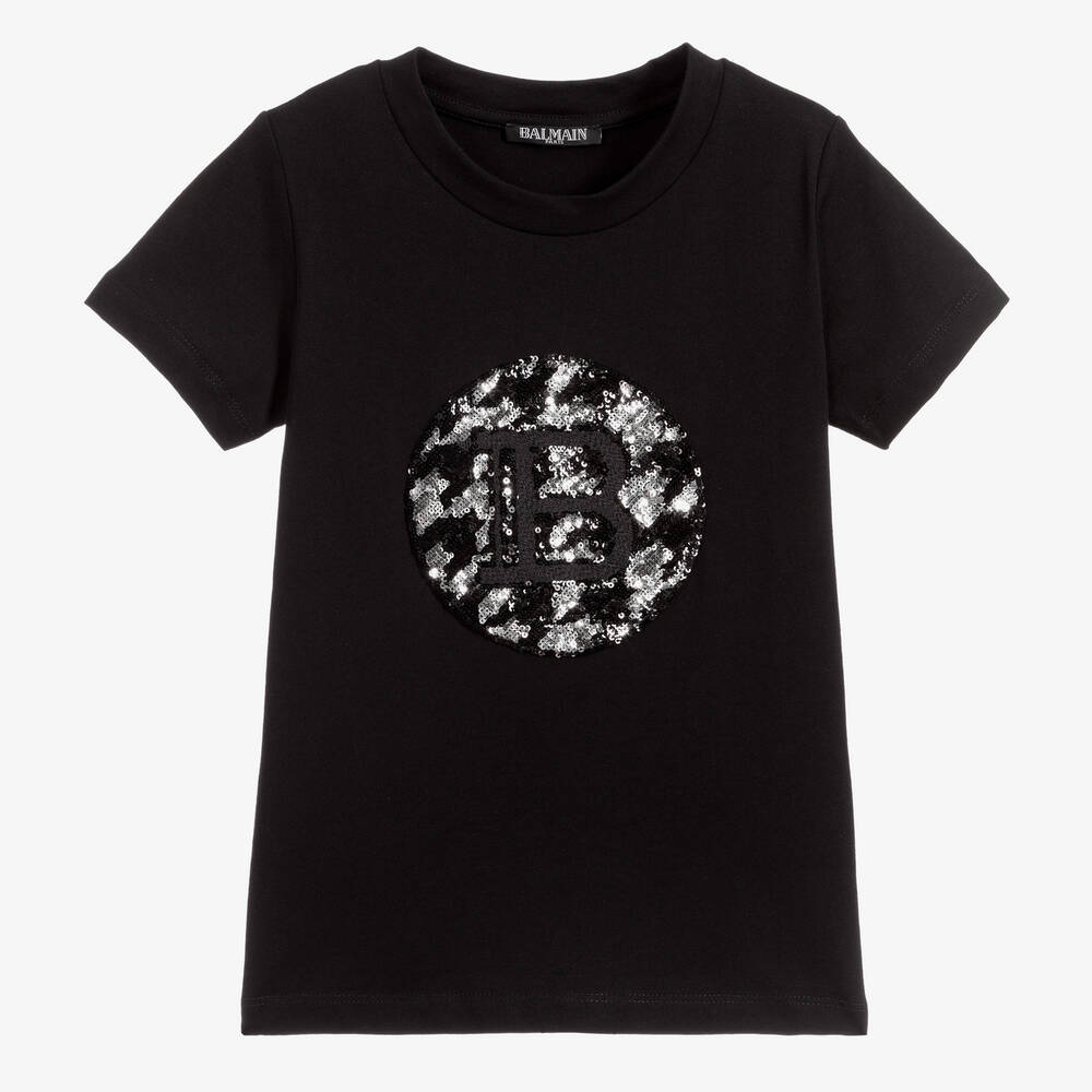 Black T-shirt for girls by luxury French brand, Balmain. Made in comfortable cotton jersey, it has the designer's silver and black sequinned logo on the front.
