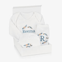 Cute black and white babysuit set for girls by luxury designer, Balmain. It has a sweet ruffle collar, a gold Balmain Paris logo on the chest and shiny gold medallion faux pockets. There are poppers on the back and between the legs for easy dressing. A white layette hat completes the lovely set, ideal for gifting.