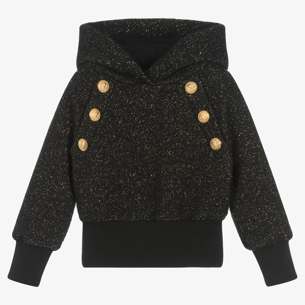A black cropped hoodie for girls by luxury French brand Balmain, knitted in a glittery gold wool blend. Designed to stand out, this casual top has gold lion buttons decorated across the chest. It has a soft jersey-lined hood and comfortable ribbed cuffs.