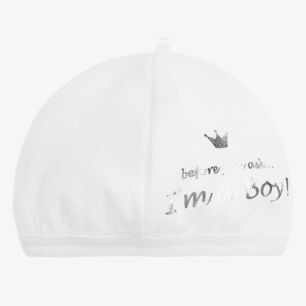 Adorable white baby hat by Bam Bam, made from soft cotton jersey with 'Before you ask...I'm a boy!' printed in metallic silver. A humorous way of avoiding those awkward questions, this hat is comfortable, practical and ever so cute.