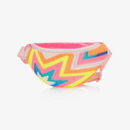 Girls metallic puff silver belt bag by Bari Lynn. There is a removable wrist strap and a rainbow belt strap, with a side zip and zip across the top. The inside is lined in fabric.