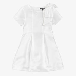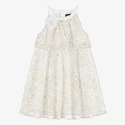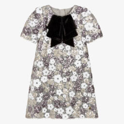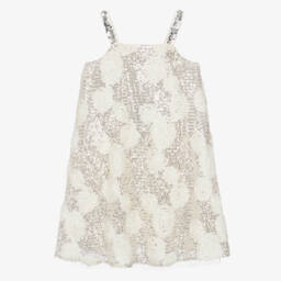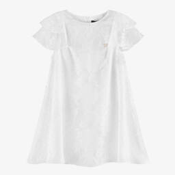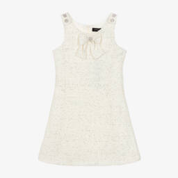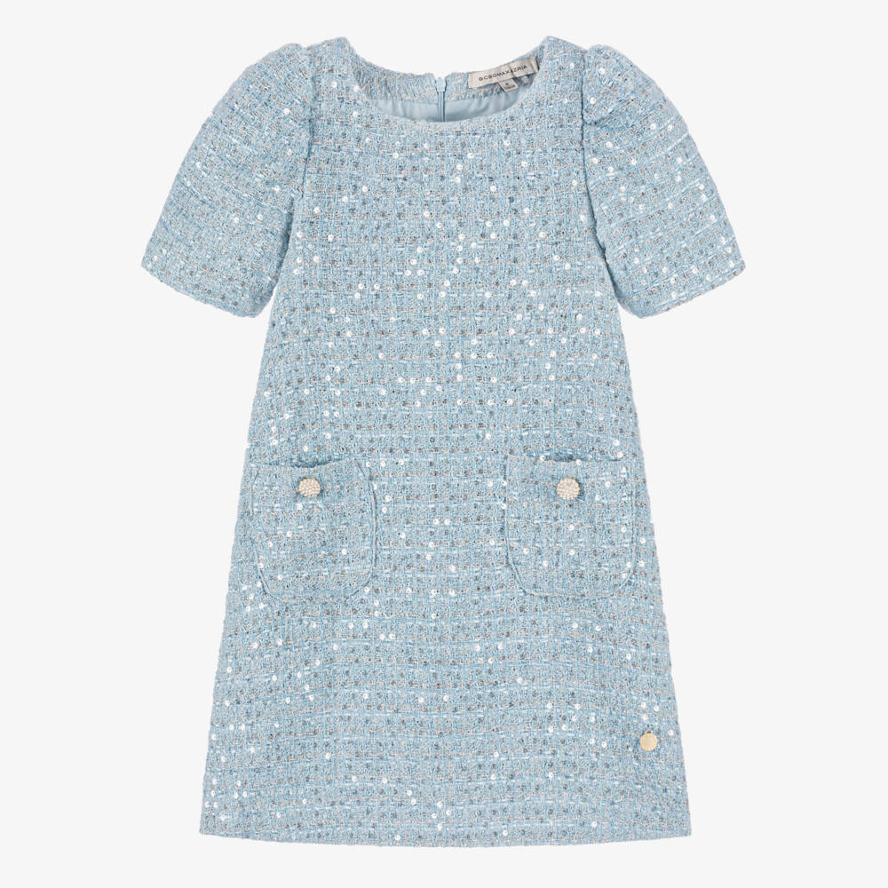 A chic sky blue dress for older girls by BCBGMAXAZRIA. The tweed fabric is fully lined and woven with fine metallic thread. It is decorated with clear disc sequins that sparkle with every twirl. The dress is timelessly styled with two front pockets, decorative diamanté buttons and short puffed sleeves. A golden BCBG coin charm adds a signature finish.