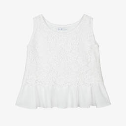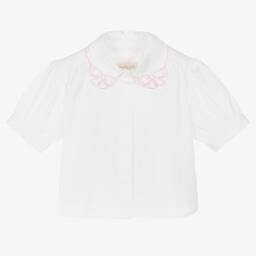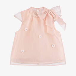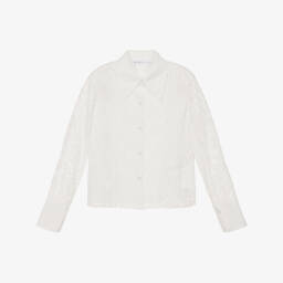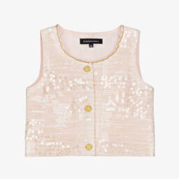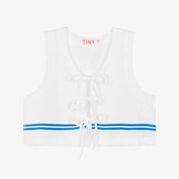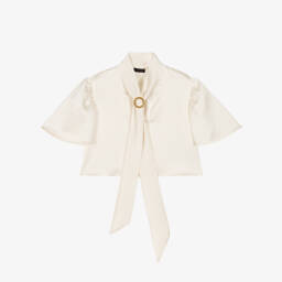 A chic off-white top for older girls by BCBGMAXAZRIA, made in soft satin with a slight sheen. Designed to sit on the waist, it has a bow detail on the neckline with a golden BCBG coin charm. It has a concealed side zip and a neat keyhole button fastening on the back of the neck.