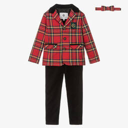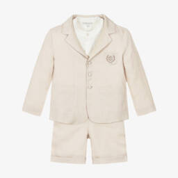 Exclusive to Childrensalon, a gorgeous special occasion suit for boys by British heritage brand Beatrice & George. Made in lustrous, soft bronze satin twill, the slightly fitted jacket has useful front pockets, a faux chest pocket and covered button fastenings. For comfort, it is lined in cotton and styled with a back vent for ease of movement. The matching trousers have slanted front pockets, an adjustable waistband for an ideal fit and a partial satin lining. A white cotton shirt completes the look, with a button-fastening, satin bow tie for a smart finish.