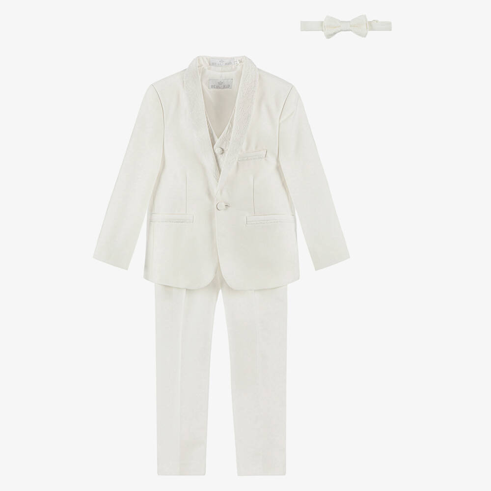 A smart ivory suit for boys by Beau KiD, made in a soft twill weave with embroidered floral detailing. The single-breasted blazer has a sophisticated shawl lapel and decorative, fabric-covered buttons on the cuff. These complement the matching floral waistcoat, styled with neat front pockets and an adjustable cinch on the back. Plain trousers are partly elasticated on the waist and fasten with a concealed zip and button. A coordinating bow tie completes this special occasion look.