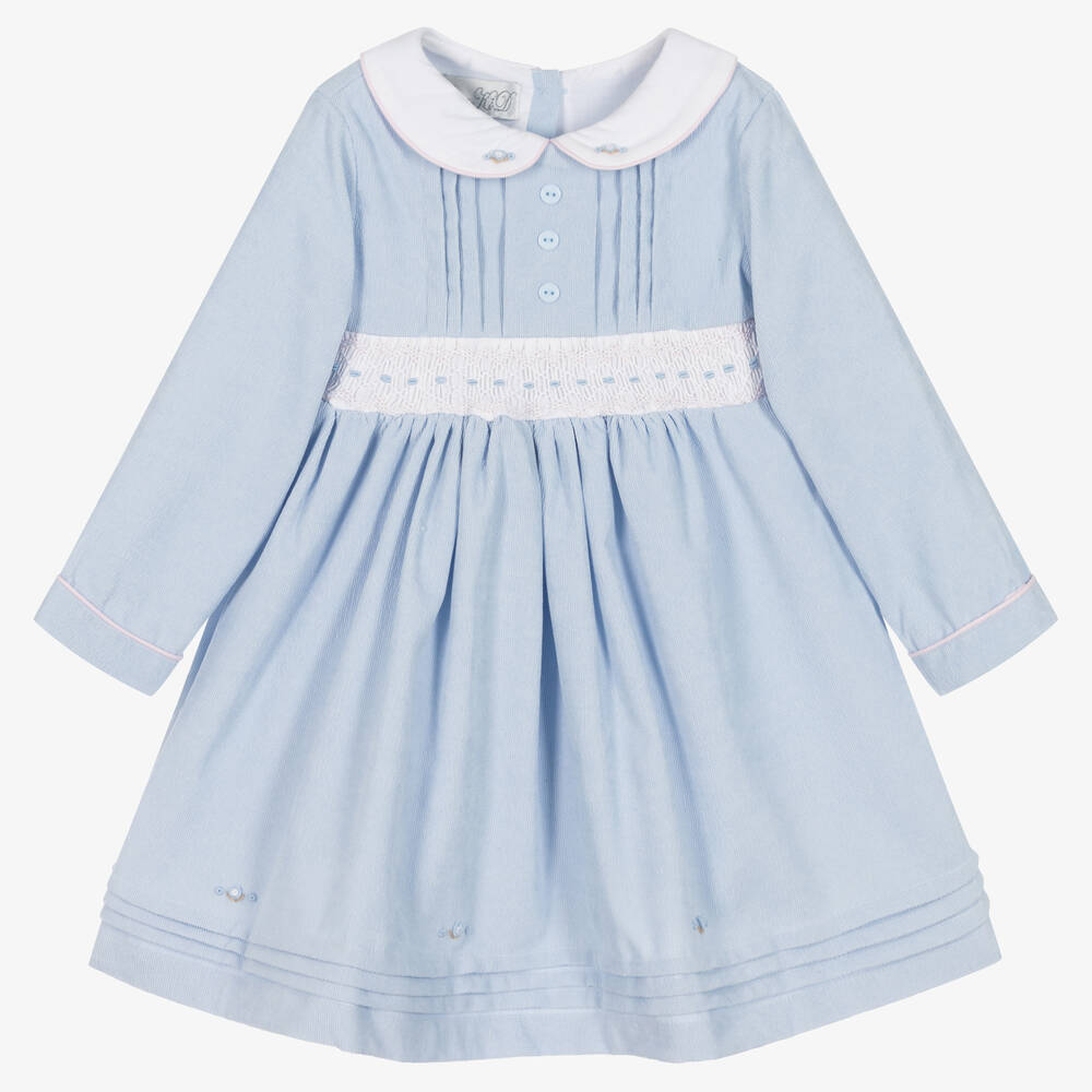 Classically styled, this blue needlecord dress for girls is from British brand Beau KiD. It has a white Peter Pan collar with floral embroidery and pale pink edging, pin tuck detailing and a beautifully smocked waist. It fastens neatly with buttons on the back and has a lightweight cotton voile lining.