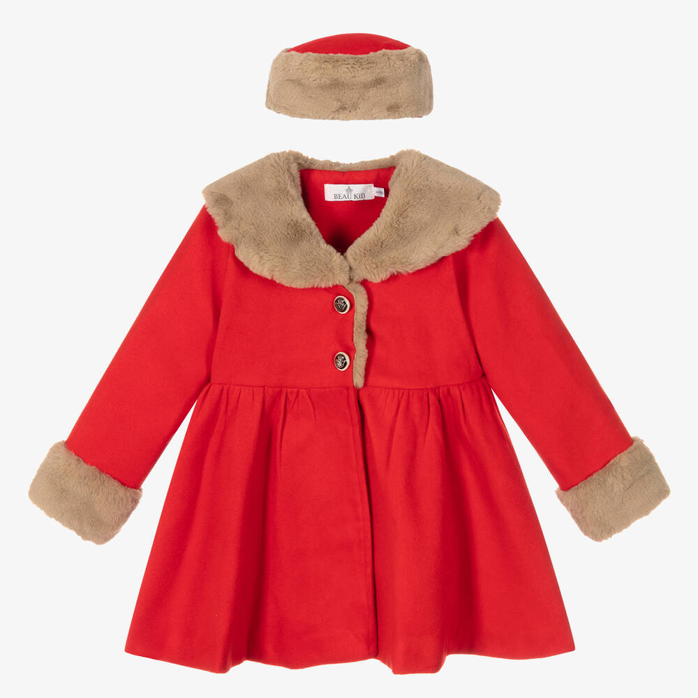 A deep red coat and hat set for girls by Beau KiD, made in a lovely soft, felted fabric. Designed with an oversized faux fur collar, it has matching beige trims on the cuffs, decorative branded buttons on the front, and a traditionally styled gathered waist. A large bow can be seen on the back, together with pretty tiered layers. Fully lined, the coat has useful side seam pockets and concealed popper closures on the front. It comes with a matching pillbox-style hat for a complete and coordinated look.