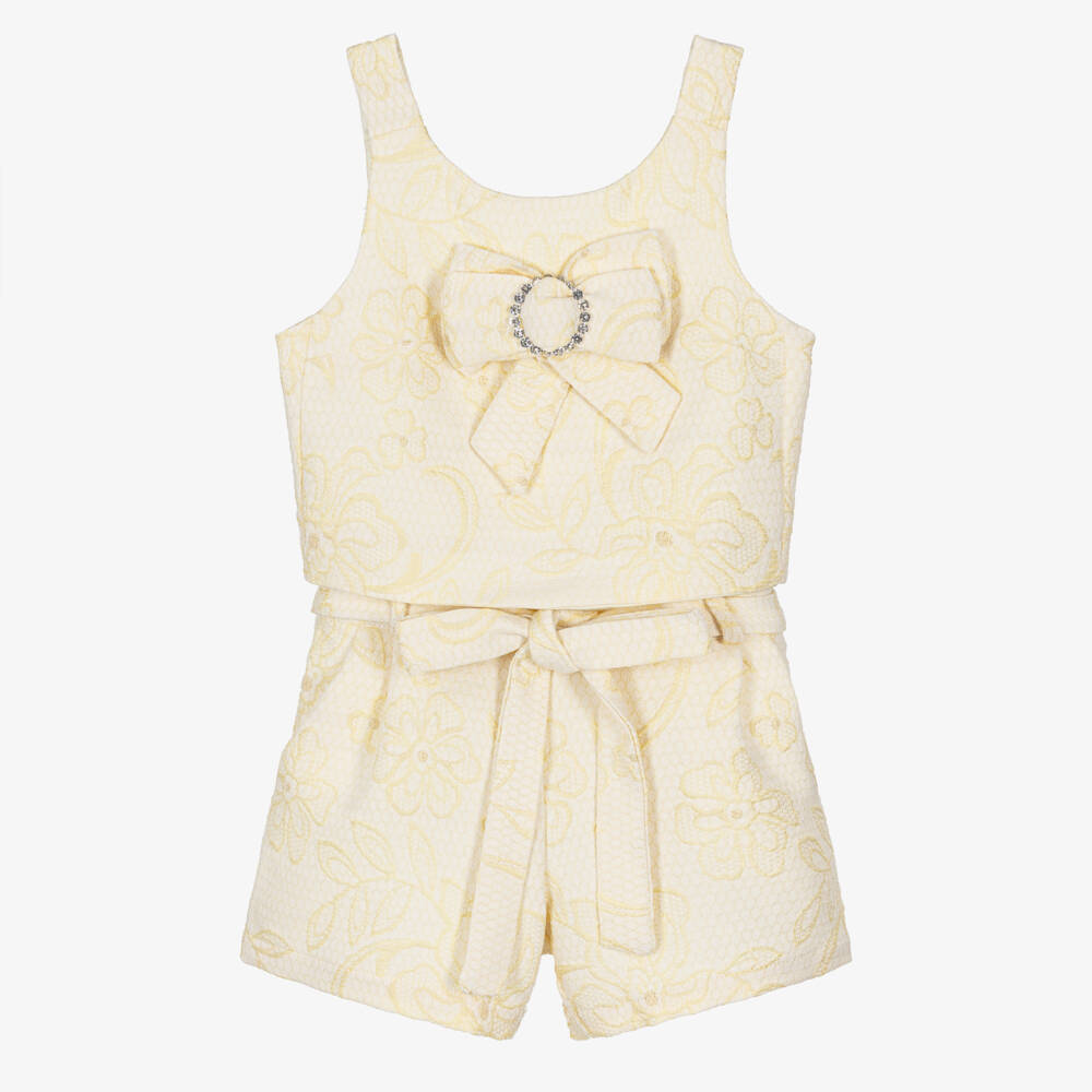Smart yellow shorts set for girls by Beau KiD, made in floral jacquard with subtle glitter accents. Lined in satin, the sleeveless top has a beautiful bow and diamanté decoration on the front and a heart-shaped button fastening on the back. The elegant, paired shorts have a flared shape with front pockets and a discreet side zip. There is an attached tie belt and a fixed bow on the back to complete the look.