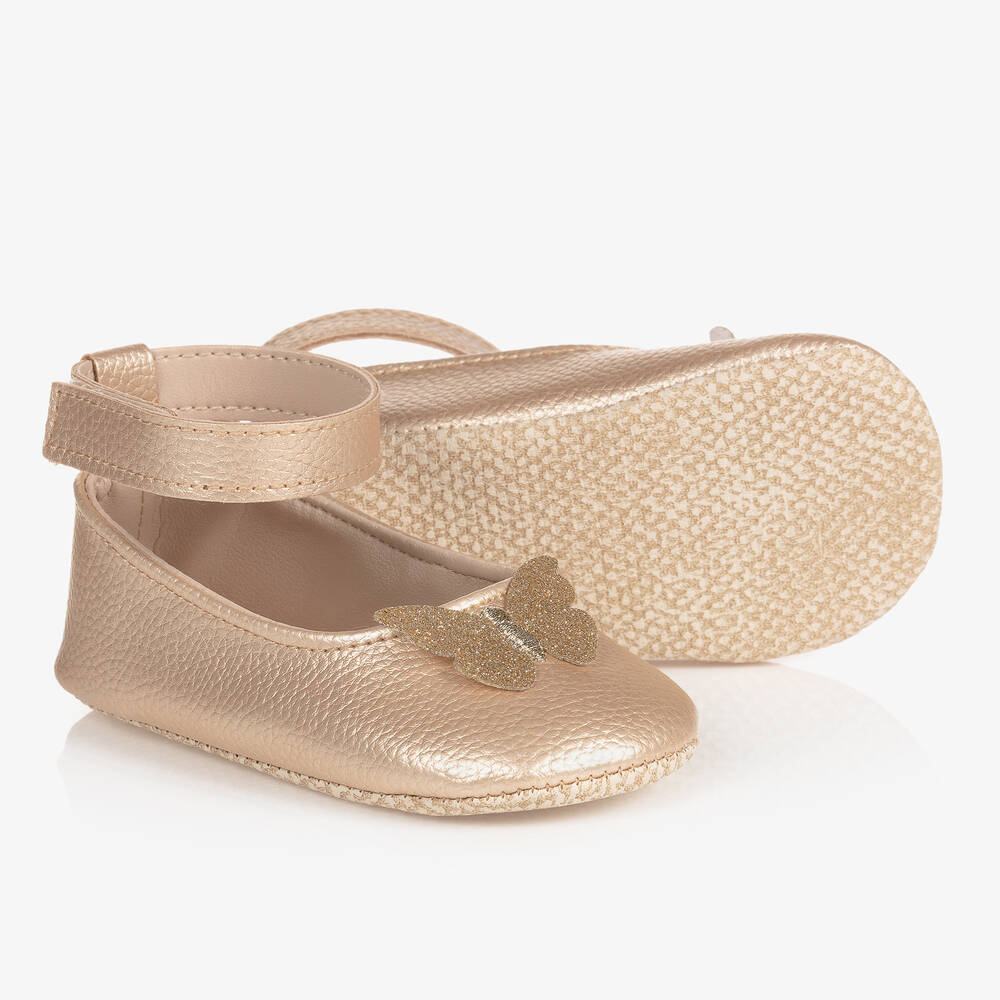 Gold faux leather pre-walker shoes for baby girls by Beau KiD. Soft and supple, they are trimmed with a sparkling gold glitter butterfly on the front. Lined in smooth faux leather, they have a velcro fastening ankle strap for easy dressing. Ideal for developing feet, they have a lightly cushioned insole and a comfortable flexible sole.