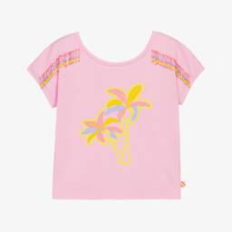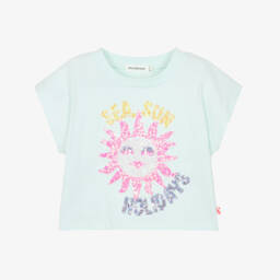 Pretty aqua blue T-shirt for girls by Billieblush, made in soft organic cotton jersey with flutter short sleeves. Adding the brand's signature touch of neon, there is a bright pink slogan, 'Dream Now', across the front in sparkly sequins.