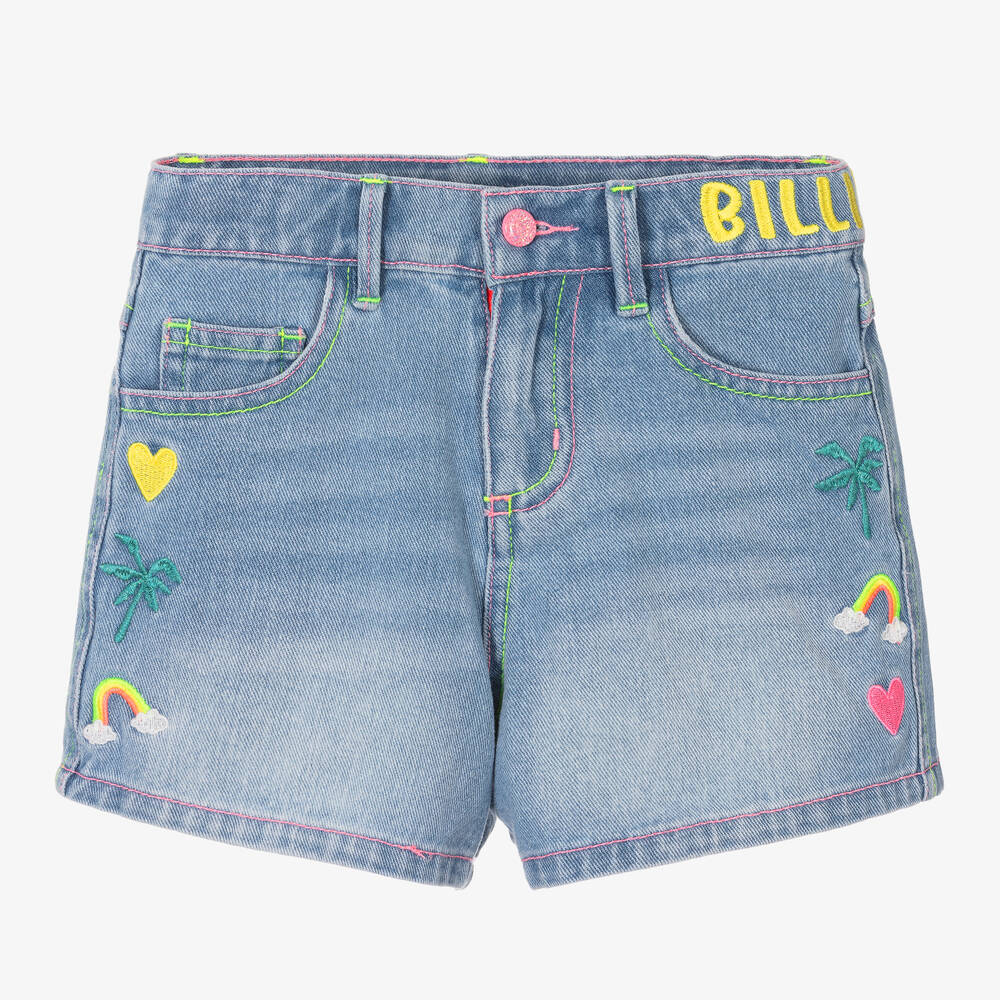 A fun pair of light blue wash shorts for girls from Billieblush, made in soft cotton denim. In a classic five-pocket design with contrast stitch detailing, they are decorated on the front with embroidered hearts, rainbows and palm trees in the brand's signature neon colours. They fasten with a sparkly pink button and zip and have an adjustable waistband for a good fit. A bold yellow embroidered logo on the waistband adds a bright, designer finish.