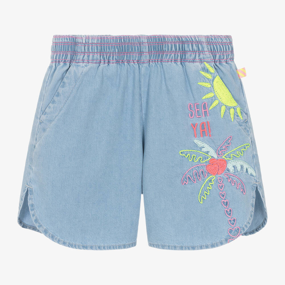 Light blue denim shorts for girls by Billieblush, made in soft and lightweight cotton. These casual shorts have an embroidered palm tree design on the front in the brand's signature neon pink and yellow shades. They have a comfortable elasticated waistband, slanted front pockets and a stylish shaped hemline.