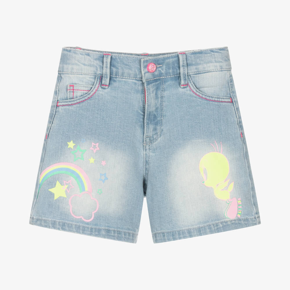 Light blue shorts for girls by Billieblush, made in soft cotton stretch denim, with faded patches on the front and back. Part of the Tweety capsule, they have a cute neon yellow and pink Tweety Pie character printed on one leg, with a colourful logo. The other leg has a rainbow, cloud and star print in matching colours. These fun shorts have three front pockets, a useful adjustable waist and they fasten with a zip and a glittery pink popper.