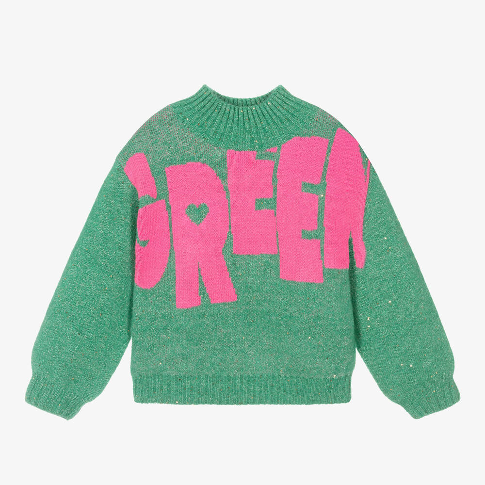 In a lovely shade of green, this long-sleeved jumper for girls is by Billieblush. It is softly knitted with a touch of wool and sparkly thread, with the word 'Green' in vibrant neon pink jacquard lettering on the chest for a bold look. Subtly stitched with tiny gold sequins for added shimmer, this high-neck top has ribbed trims and the brand's iconic striped tab on one side seam.