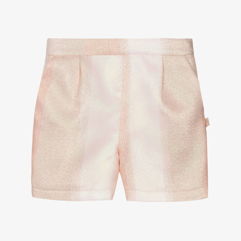 Smart and stylish blush pink shorts for girls by Billieblush, with a beautiful iridescent shimmer and a subtle ombré striped weave. Designed with slanted front pockets and a discreet zip and popper fastening on the side, they have an adjustable waist for a comfortable fit. They are lined in satin for comfort.