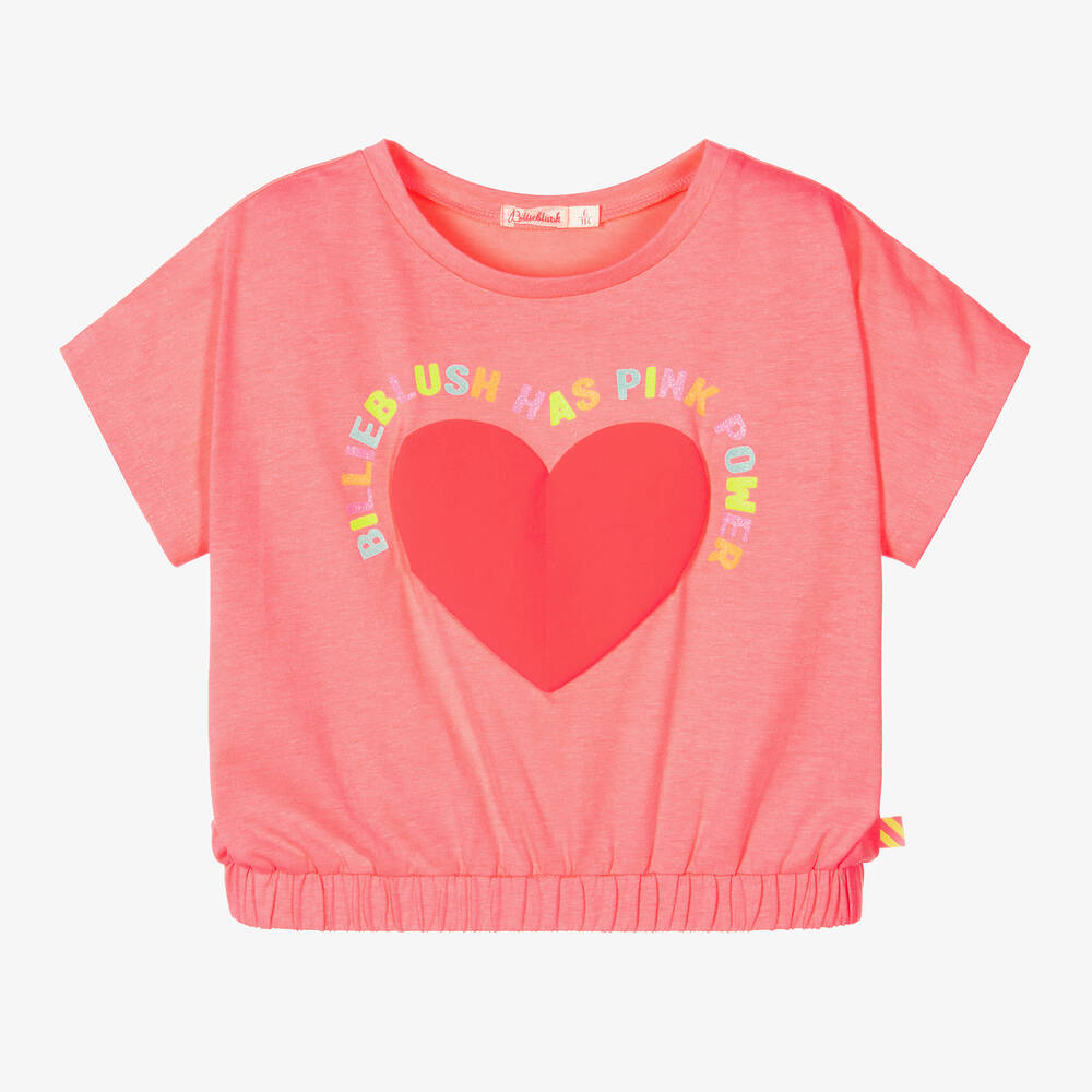 In a bright neon pink shade, this eye-catching T-shirt for girls is from Billieblush. For added appeal, it has a raised pink heart print with a colourful, glittery slogan logo on the front. Made in a soft and lightweight cotton blend jersey, with seamless short sleeves, it has a relaxed fit and an elasticated hem that sits on the waist.
