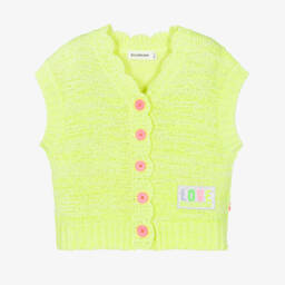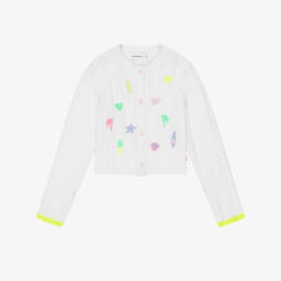 A statement cardigan for girls by Billieblush, in a vibrant shade of pink with tonal button fastenings. Knitted with a lovely moss stitch pattern, this crew neck style has dramatic tulle ruffles on the dropped shoulder sleeves.