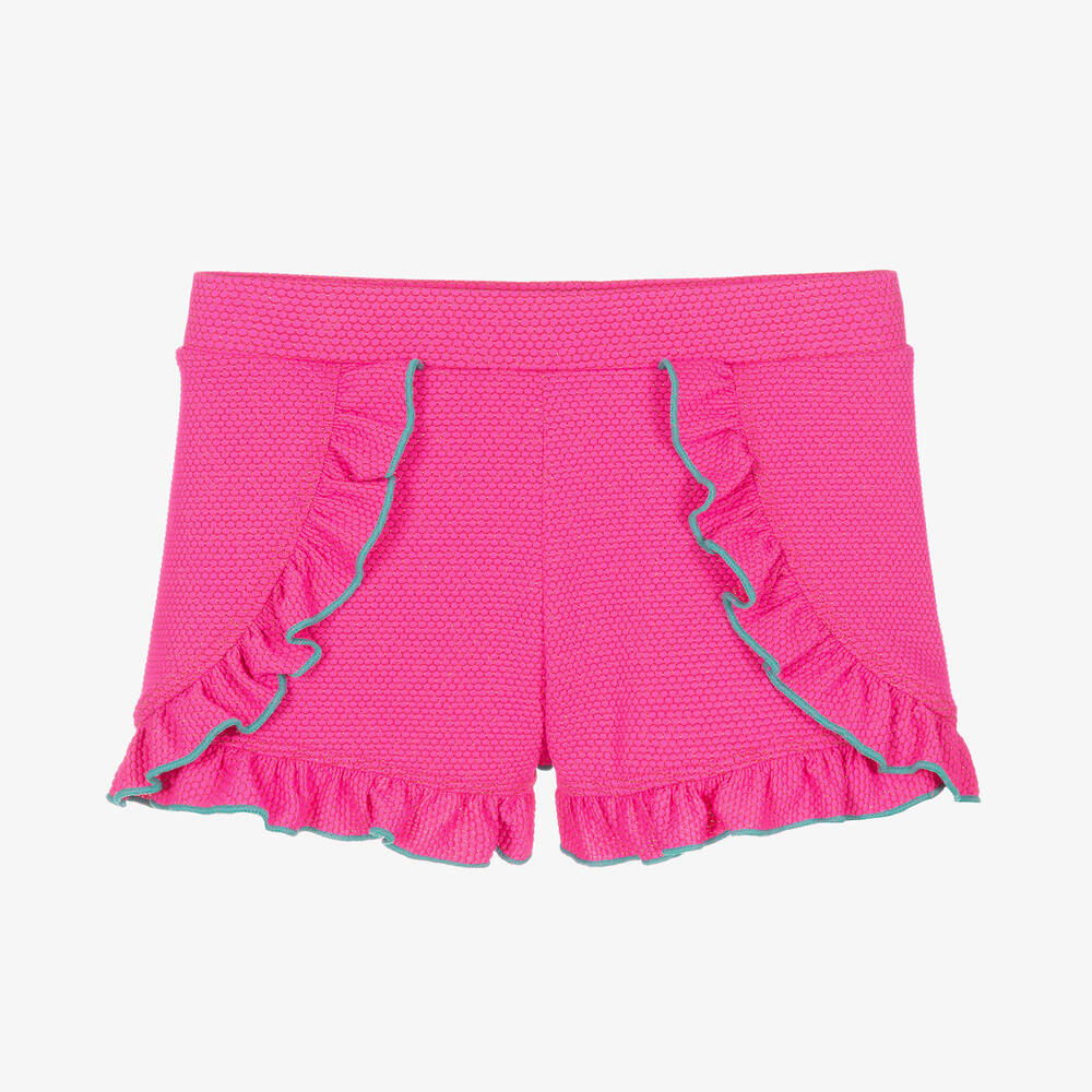 Lovely bright pink swim shorts for girls by Billieblush, made in a honeycomb textured fabric with shimmery gold detailing. Fully lined for comfort, this simple, pull-on style has pretty ruffle trims with contrasting teal blue edging.