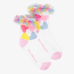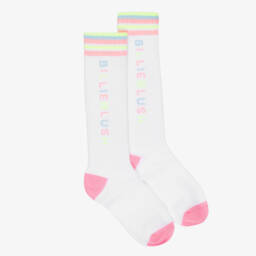 Sparkly socks for girls by Billieblush, striped in eye-catching shades of pink, yellow, green and purple. Made in a soft and stretchy cotton blend, this knee-length style is patterned with the designer's logo around the top.
