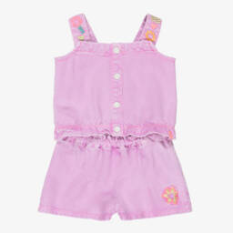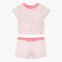 White shorts set for little girls by Billieblush. The cotton jersey top has a pink and lilac purple 'Love' print on the front with a cute ladybird. It fastens with poppers on the back. The lightweight shorts are lined in soft voile and are patterned with bright and colourful, clouds, rainbows, flowers and ladybirds. They have a glittery, neon pink, elasticated jacquard logo waistband for a sparkly finish.