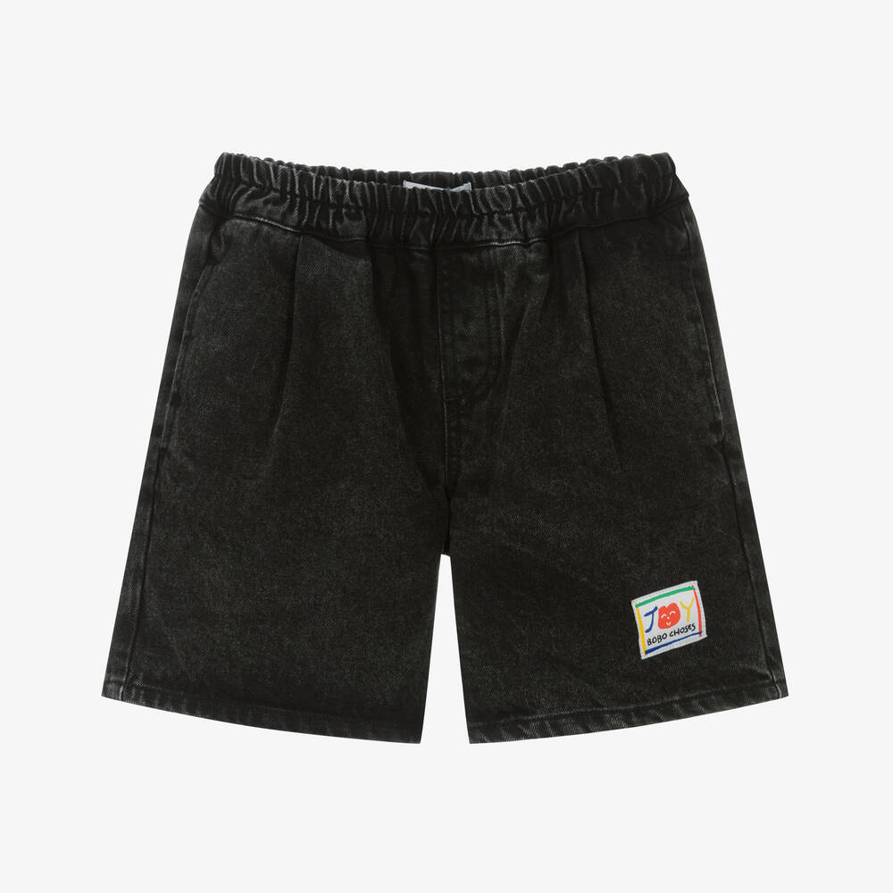 Washed black shorts for boys by Spanish brand Bobo Choses, made in mid-weight, organic cotton denim. They are simply styled with neat side pockets and an elasticated waist for easy movement. There is a small logo patch on one leg with colourful Joy collection branding.