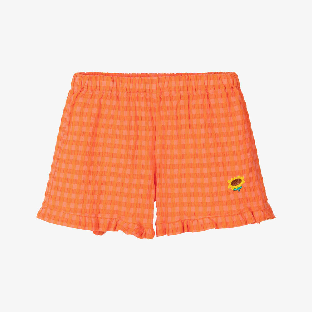 Lovely orange gingham check shorts for girls by Bobo Choses, made in lightweight cotton seersucker. This comfortable, casual style has an elasticated waistband, frilled cuffs and a sweet embroidered sunflower on the front.
