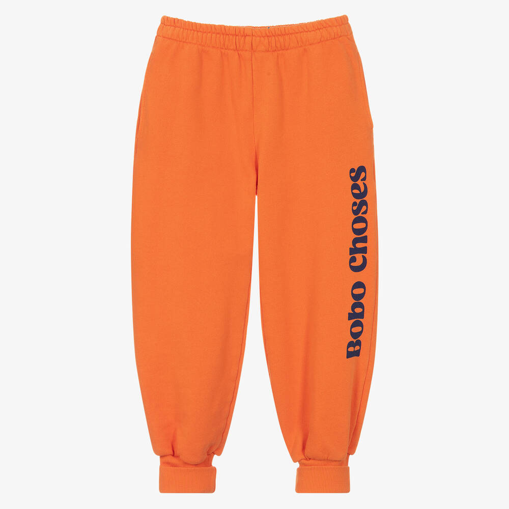 Bright orange joggers for boys and girls by Bobo Choses, made in mid-weight organic cotton jersey. To move with freedom, these casual trousers have an elasticated waistband with inner drawstring ties. They have ribbed cuffs and practical side seam pockets to store their essentials. A navy blue logo is printed on one leg.