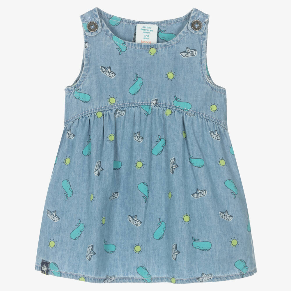 Blue chambray dress for baby girls by Boboli, made in a soft and lightweight cotton weave. A sleeveless design, it has an all-over nautical-inspired print featuring blue whales, sunshines and boats. It gathers gently at the waist and buttons on the shoulders for a comfortable fit. The dress comes with a pair of matching knickers with elasticated trims to cover a little one's nappy.