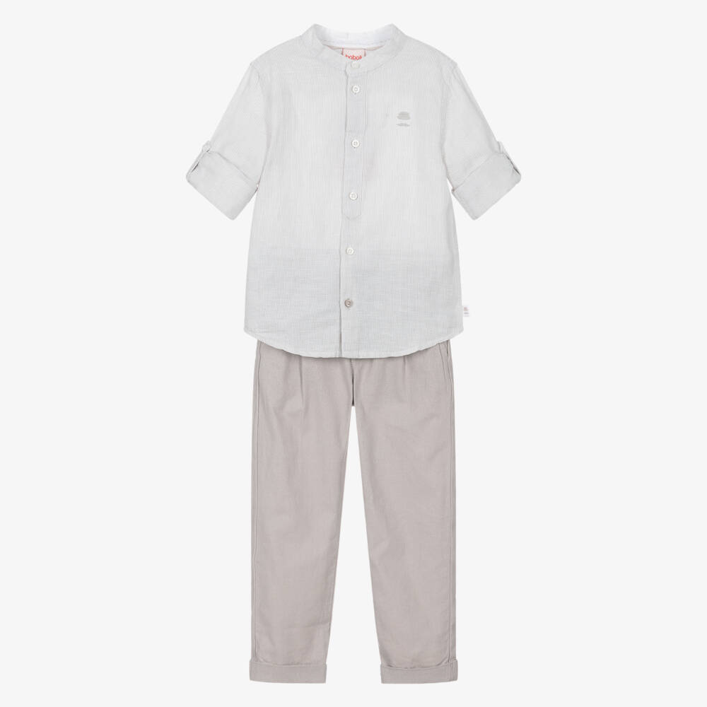 Boys beige trouser set by Boboli, made in a lightweight blend of linen and cotton. The striped, collarless shirt has button tabs on the long sleeves, allowing them to be neatly rolled up for a more casual look. The trousers are styled with fixed turn-up cuffs and useful pockets, with an adjustable waistband for an ideal fit.