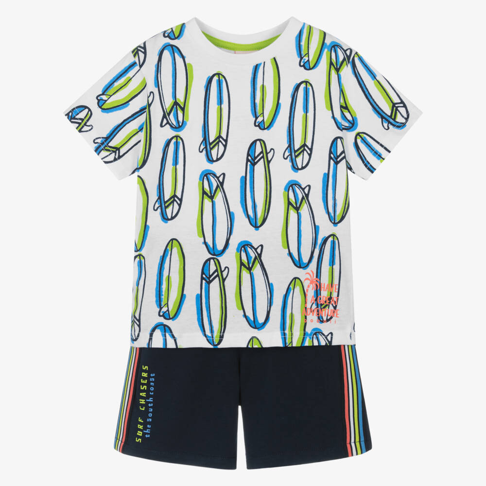A casual, white and blue, surf-themed shorts set for boys by Boboli, made in soft cotton jersey. The T-shirt features a blue and green surfboard pattern and the shorts have sporty, striped trim and a comfortable drawstring waistband. Side seam pockets and a patch pocket on the back add a practical finish.