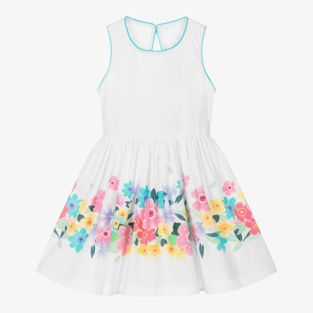 A lovely white cotton dress for girls by Boboli, ideal for warmer days. This pretty style has a sleeveless bodice with a blue, piped trim and a shaped open back. The full skirt is patterned with a beautiful floral print in vibrant shades of pink, yellow and blue. The dress is lined for comfort and fastens with a concealed zip and button.