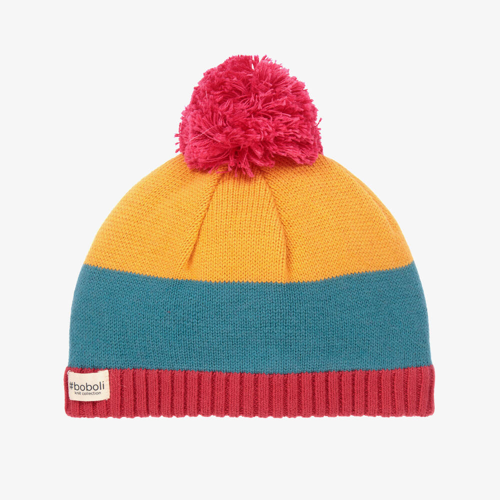 Girls yellow, blue and red striped beanie hat from Boboli, made from a soft blend of cotton, viscose and wool in a mid-weight knit. It has a soft fleece lining for extra cosiness and a cute pink pom-pom on the top.