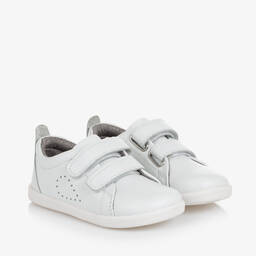 Sporty and lightweight white trainers for little boys by Bobux IWalk, with contrasting blue trims. Ideal for active play, they are made and lined in premium leather with a lightly cushioned insole, padded ankle and a flexible, non-slip rubber outer sole. They fasten with an adjustable velcro strap for a secure, comfortable fit.