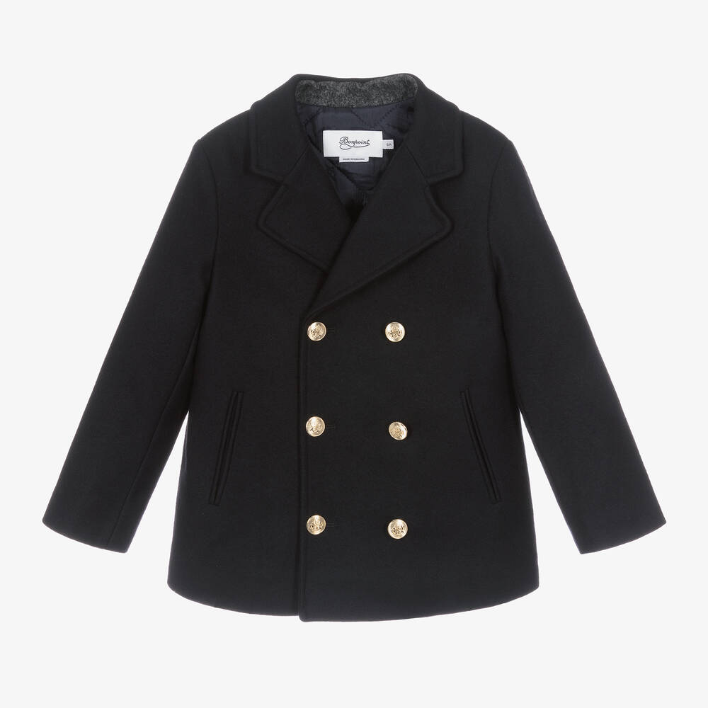 A smart navy blue peacoat for boys by French brand Bonpoint. Proving superior warmth, it is made in a luxurious wool blend with a soft felted feel. It fastens with elegant gold crested buttons on the front, in a classic double-breasted style. There is a silky quilted lining for added comfort, with slanted welt pockets on the front to finish.