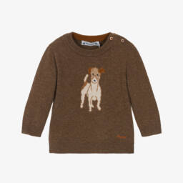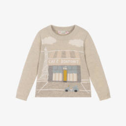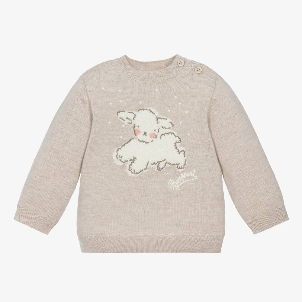 A sweet beige sweater for little girls by Bonpoint, knitted in warm Merino wool for a soft and gentle feel against the skin. This lovely design has an adorable jacquard lamb motif on the front with an embroidered signature below. It has comfortable ribbed finishes and button fastenings on one shoulder for easier dressing.