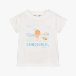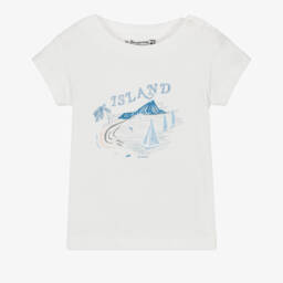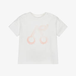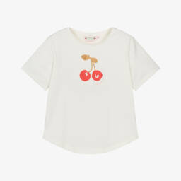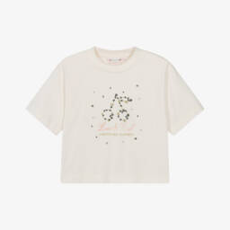 Blush pink T-shirt for girls by luxury French label Bonpoint, made in soft cotton jersey with pretty puffed sleeves. It features a beautiful 'Amour' appliqué on the front made from floral print Liberty fabric, accompanied by the brand's pink embroidered cherry logo for a distinctive look.