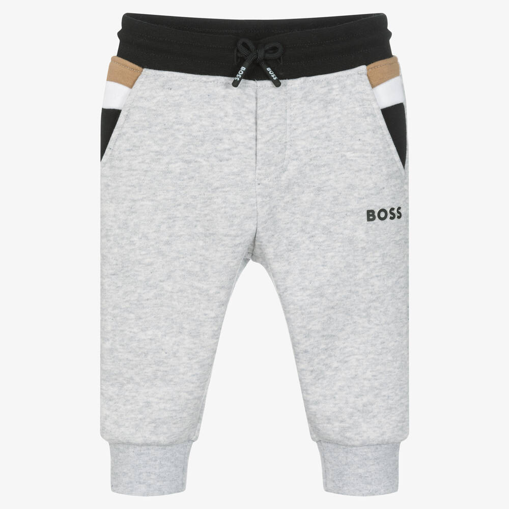Mini-me, grey marl joggers for baby boys from BOSS, made in mid-weight cotton-blend jersey with a cosy fleece feel inside. Soft and comfortable, they have a gently elasticated waistband with branded drawstring ties for an adjustable fit. There is a rubberised logo on one side and the brand's signature stripes in beige, white and black can be seen on the front.