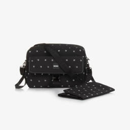 Silky smooth black changing bag by BOSS, with a bold textured logo on the front. Both stylish and practical, it has a zip-fastening main compartment, with multiple internal mesh pockets and external zipped and popper-fastening pockets for easy organisation. Trimmed with the designer's signature tricolour stripes, the bag has carry handles and a detachable adjustable shoulder strap. It comes with a useful changing mat and detachable buggy straps for attaching to a stroller.